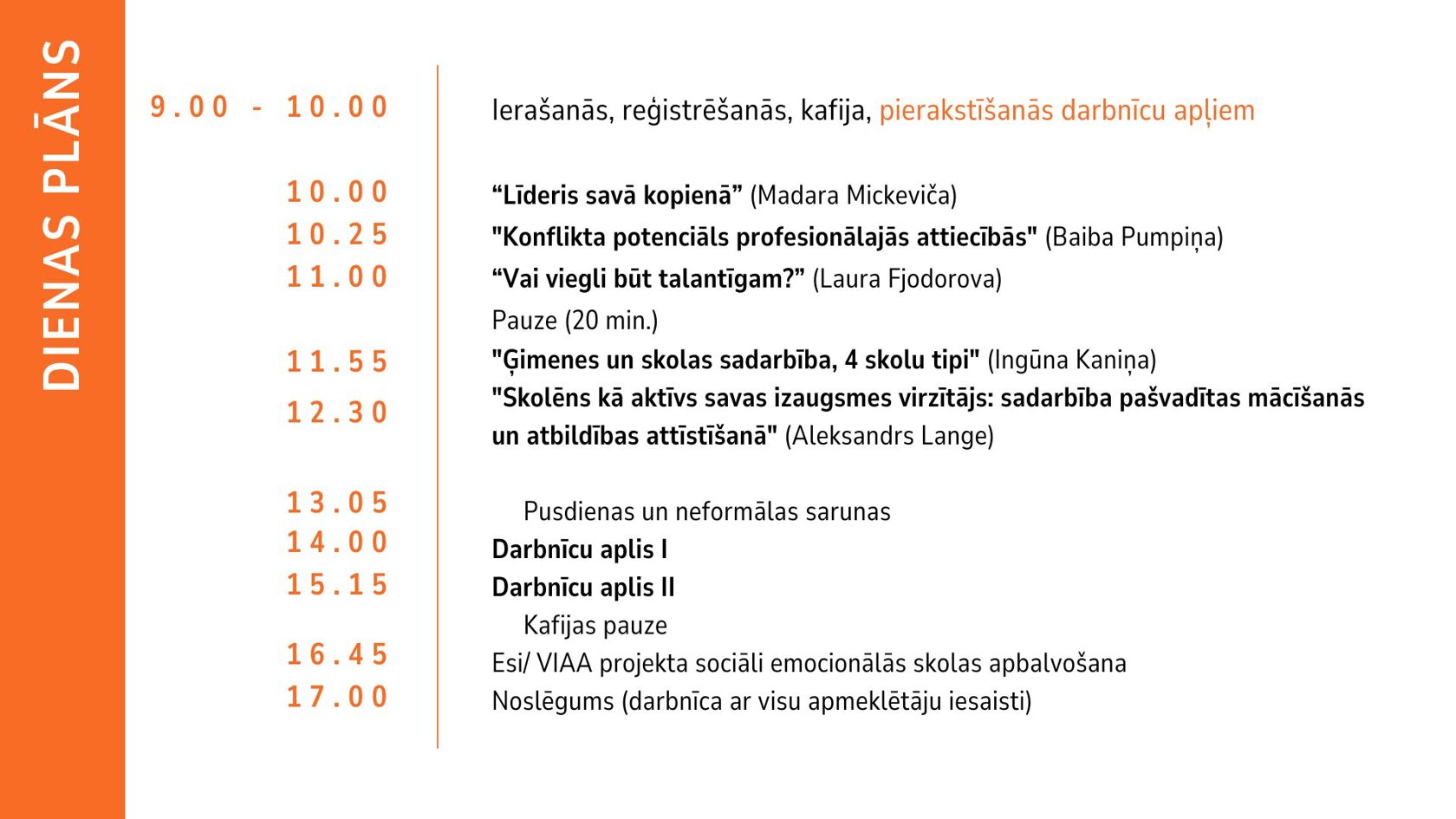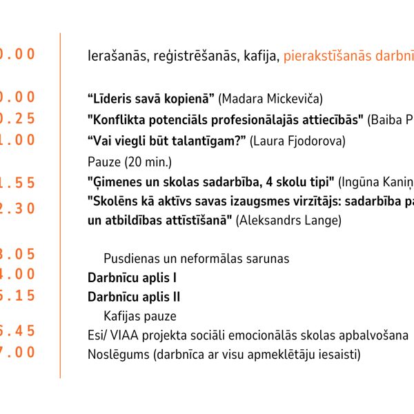 Konferences ietvaros lielajā zālē notiks 5 iedvesmojošas un izglītojošas īslekcijas par aktuālām tēmām. Divos paralēlos darbnīcu apļos būs iespēja iepriekš pieteikties uz sev interesējošām 60 minūšu praktiskām darbnīcām (katram dalībniekam iespējams apmeklēt divas darbnīcas pēc kārtas). Tam sekos VIAA STEM + Pilsoniskā līdzdalība projekta sociāli emocionālās skolas apbalvošana un noslēguma aktivitāte visiem kopā lielajā zālē.